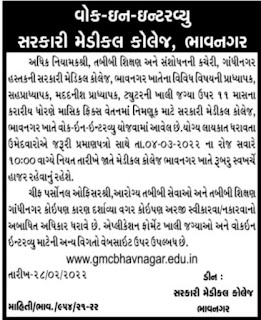 A walk-in-interview has been organized at Government Medical College, Bhavnagar for appointment on monthly fixed salary on an 11-month contract basis on the vacancy of.